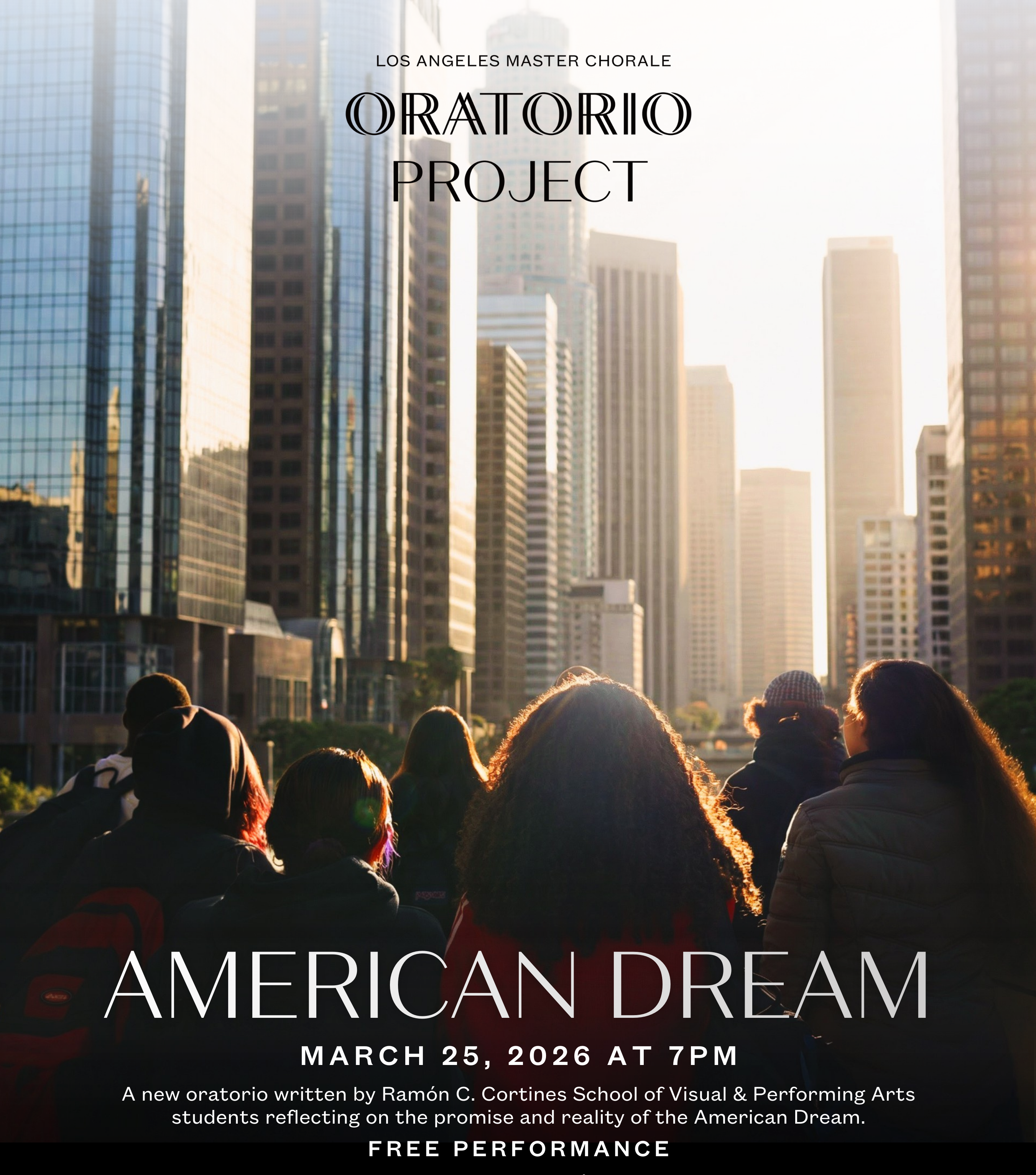 American Dream is a new nine-movement oratorio written by students at Ramón C. Cortines School of Visual & Performing Arts in Los Angeles. Through their own words, the young writers explore how their generation understands the American Dream, drawing from history, family stories, and their everyday lives. The result is a deeply personal portrait of hope, complexity, and the future they imagine for themselves.